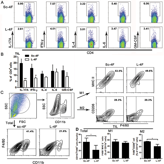 Figure 4: L-4F decreases Th17 cell, Th1 cell and TAM populations in a mouse pancreatic cancer model. Tumors were collected from Sc-4F- or L-4F-treated mice. Single-cell suspensions were acquired and stained as described in the Materials and Methods section. (A) One representative result from each experiment is shown. (B) The percentages of IL-17A-, IFN-γ-, IL-4-, IL-6- and GM-CSF-producing cells among tumor infiltrating Th cells (*P < 0.05, **P < 0.01). Th17 and Th1 cells represent two particular subsets of T helper lymphocytes characterized by production of IL-17 and IFN-γ cytokines, respectively. (C) The percentage of CD11b+F4/80+ cells among tumor infiltrating cells. The number of F4/80+ macrophages among the total CD11b+cells was quantified. (D) The blot shown was gated on CD11b+ cells, and an F4/80+MHC II+ and F4/80+CD206+ flow plot was used to identify M1 and M2 macrophages, respectively. The number of F4/80+MHC II+ and F4/80+CD206+ macrophages among the total CD11b+ cells was quantified (*P < 0.05).