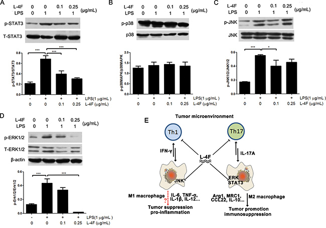 Figure 6: L-4F down-regulated STAT3 and MAPK signaling pathways in lipopolysaccharide-treated RAW 264.7 cells. RAW 264.7 macrophages were treated with the indicated concentrations of L-4F and then stimulated with LPS. The levels of pSTAT3, pp38, pJNK and pERK were analyzed by western blotting, and the results are shown in (A–D) respectively (*P < 0.05, **P < 0.01). (E) Regulation mechanism of L-4F in the tumor microenvironment. The tumor microenvironment (TME) is a highly dynamic system that adopts a variety of activation states in response to inflammation. L-4F is a negative regulator of Th1 and Th17 cells as well as macrophages in the TME. Specifically, L-4F is a crucial suppressor of M2-type macrophage polarization and inhibits IFN-γ and IL-17A production in response to the TME. Mechanistically, L-4F suppresses the STAT3, ERK and JNK signaling pathways in macrophages. These pathways are critical for tumor progression and eventually lead to fatal outcomes.