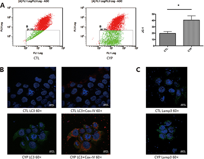 Figure 3: CYP11A1 overexpression lead to mitochondrial member potential depolarization and mitophagy in BeWo cell line. (A) Flow cytometry analysis of JC-1 staining indicate that overexpression of CYP11A1 induce member potential depolarization in BeWo cell line. (B) Immunofluorescence staining shows that overexpression of CYP11A1 induces mitochondrial localization of LC-3. Cox-IV was used as mitochondrial marker. Increased colocalization of LC-3 (green) and Cox-IV (red) was shown after CYP11A1 overexpression. (C) Immunofluorescence staining show that overexpression of CYP11A1 induces Lamp3 expression. Colocalization of LC-3 (green) and Cox-IV (red) was shown in the right panel. * means P < 0.05.