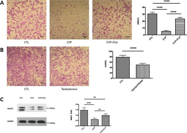 Figure 4: CYP11A1 overexpression compromise trophoblast invasion and inhibit MMP-2 expression. (A) The picture shows that trophoblast invasion could be inhibited by CYP11A1 overexpression, which could be rescued by flutamide treatment. (B) Testosterone treatment could inhibit trophoblast invasion. (C) Western blot result of MMP-2 shows that overexpression of CYP11A1 could inhibit MMP-2 expression, which could rescued by androgen receptor (AR) inhibitor, flutamide. The statistic result is shown in the right panel. * means P < 0.05, ** means P < 0.01, *** means P < 0.001,****means P < 0.0001.