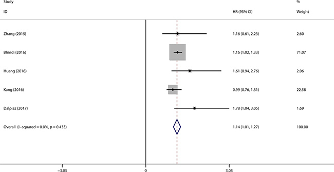 Five studies comprising 2754 patients were included in the meta-analysis of PLR in OS. The cut-off values ranged from 124 to 241.2. For zhang’s study, there are two HRs derived from the analysis with 140 used as cut-off value or continuous variable in the same population. To decrease the heterogeneity among the studies, we just extracted the HR and related 95% CI from the analysis with 140 used as cut-off value. The pooled HR from meta-analysis was 1.14 (95% CI = 1.01–1.27, p < 0.001) with no significant heterogeneity among the studies (I2 = 0.0%, Ph = 0.433), as shown in Figure 2. Furthermore, sub-group analyses were performed according to the cancer types, stratification of cut-off values, number of patients, ethnicity. The results from sub-group analyses were listed in Supplementary Table 1. There was no significant heterogeneity among the studies included for all the analyses.