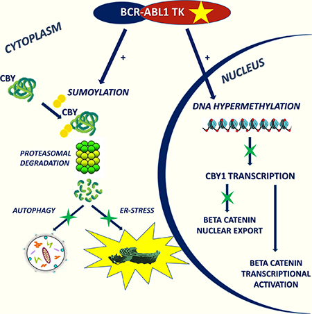 Figure 1: CBY1 down-modulation associated with BCR-ABL1 TK promotes β-catenin retention in the nucleus and its transcriptional activation. It is driven by transcriptional and post-transcriptional events involving DNA hyper-methylation and protein enhanced degradation. Through its effects on β-catenin sub-cellular localization, CBY1 impacts UPR and autophagy in clonal hematopoietic progenitors.