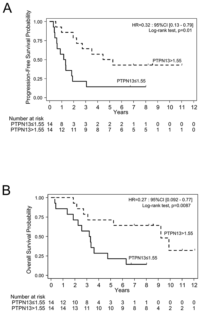 In the 28 patients from whom these HGSOC samples were obtained, the median progression-free survival (PFS) time was 2 years (95% confidence interval, CI, [1.18 - 4.46]) and the 5-year PFS rate was 32.1% (95% CI [16.2% - 49.3%]). Then, patients were divided in two groups according to the median tumor PTPN13 mRNA expression level (≤1.55: low PTPN13 group; >1.55: high PTPN13 group). The median PFS time was 1.2 years (95% CI [0.44 - 1.91]) in the low PTPN13 group, and 4.5 years (95% CI [1.96 - not reached]) in the high PTPN13 group. Similarly, the 5-year PFS rate was 14.3% (95% CI [2.3% - 36.6%]) in the low PTPN13 group and 50.0% (95% CI [22.9% - 72.2%]) in the high PTPN13 group.