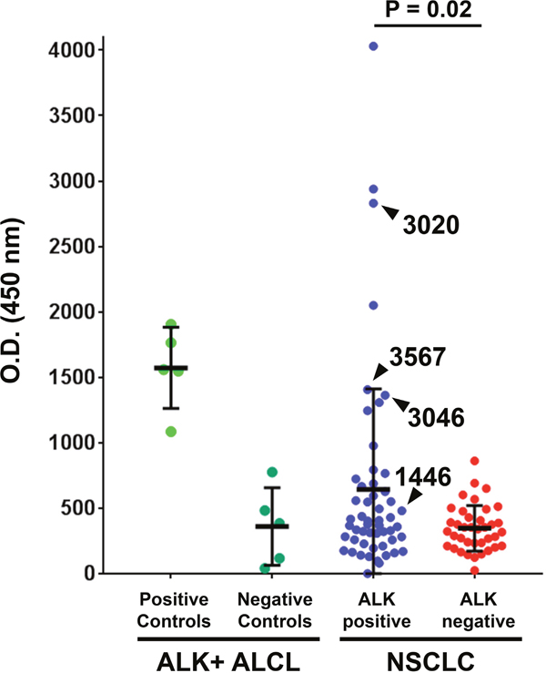 Blood was collected from 53 ALK-positive stage IV NSCLC patients and 38 ALK-negative stage IV NSCLC patients during the course of routine clinical care at our institution. Among the patients with ALK-rearranged NSCLC, 17 were TKI-naïve and 36 had been exposed to at least one ALK TKI at the time of blood collection. ALK-positive NSCLC patients had a significantly higher mean O.D. level (range 0 to 4031, mean ± SD = 643.4 ± 767.8) compared to ALK-negative NSCLC patients (range 24 to 861, mean ± SD = 346.8 ± 174.9, P = 0.02), as shown in Figure 1. High ALK autoantibody levels (defined in this study as an O.D. value greater than three standard deviations above the mean among ALK negative NSCLC cases, i.e. > O.D. 871.5) were detected in 9 of 53 (17.0%) ALK-positive NSCLC cases and 0 of 38 (0%) ALK-negative NSCLC cases (P < 0.01). Among the 26 ALK-positive NSCLC patients in whom at least 3 serial serum samples were available, antibody levels typically did not greatly vary over time within an individual (Supplementary Figure 3).