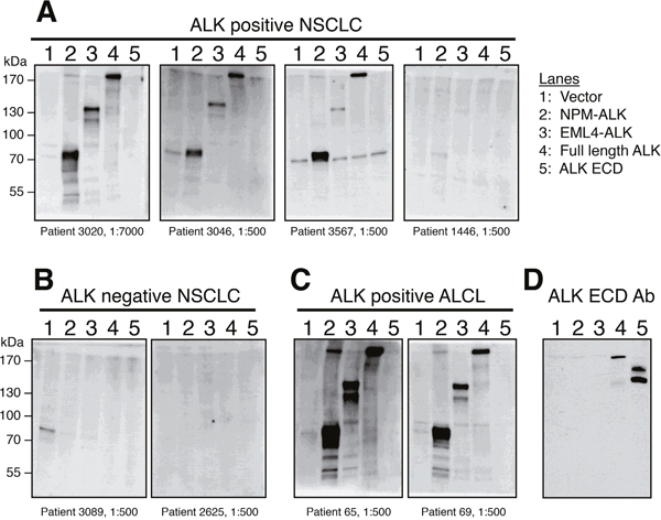 Figure 2: Western blot analysis confirms that ALK-positive NSCLC patient serum specifically recognizes the ALK intracellular domain (ICD). (A) Three ALK-positive NSCLC patients with high (patients 3020, 3567, and 3026) ELISA O.D. values were analyzed by Western blot and showed strong reactivity to NPM-ALK, EML4-ALK, and recombinant full-length ALK, but not to the extracellular domain (ECD) of ALK which is not included in ALK fusions. Serum from one ALK-positive NSCLC patient (patient 1446, A) and two ALK-negative NSCLC patients (B) with low ELISA O.D. values did not detect any of the ALK proteins by Western blot. (C) Western blots using serum from two ALK-positive ALCL patients are shown as a positive control. (D) A monoclonal antibody raised against the ALK extracellular domain (ECD) [28] detects only full-length ALK and the ALK ECD, but not the fusion proteins NPM-ALK or EML4-ALK.