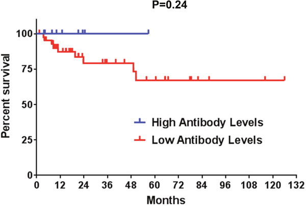 Figure 4: A Kaplan-Meier overall survival analysis is shown for ALK-positive NSCLC patients with high and low anti-ALK antibody levels. Censored events are represented as vertical tick marks. High antibody titers (>871.5 O.D.): 9 patients; low antibody titers (≤871.5 O.D.): 44 patients.