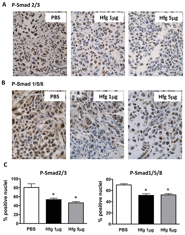 Figure 4: Halofuginone reduces TGF-β and BMP signaling in vivo. Immunohistochemistry of (A) phospho-Smad2/3 and (B) phospho-Smad1/5/8 tumor tissue sections from limbs of mice with bone metastases caused by MDA-MB-231 cells and treated with Hfg (1μg/5μg) or PBS. (C) Quantitative analysis of nuclei positives for phosphorylated Smad2/3 or Smad1/5/8 in bone metastases. *P<0.05 vs PBS using One-way ANOVA Bonferroni’s post-test.