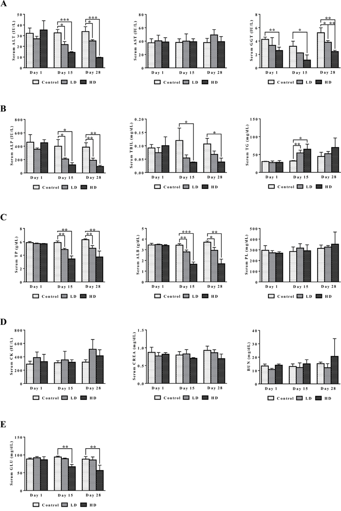 Figure 2: Serum biochemistries after repeated diclofenac treatment for 28 days. (Panel A1-A3) ALT, AST and γGT. (Panel B1-B3) ALP, TBIL, TG. (Panel C1-C3) TP, ALB, PL. (Panel D1-D3) CK, CREA, BUN. (Panel E) Serum glucose. LD = low dose, HD = high dose, *p<0.05, **p<0.01, ***p<0.001.