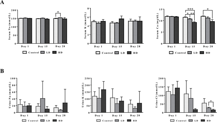 Figure 4: Serum and urine electrolytes after repeated diclofenac treatment for 28 days. (Panel A1-A3) Serum Na, K and Ca. (Panel B1-B3) Urine Na, K and Cl. LD = low dose, HD = high dose, *p<0.05, **p<0.01, ***p<0.001.