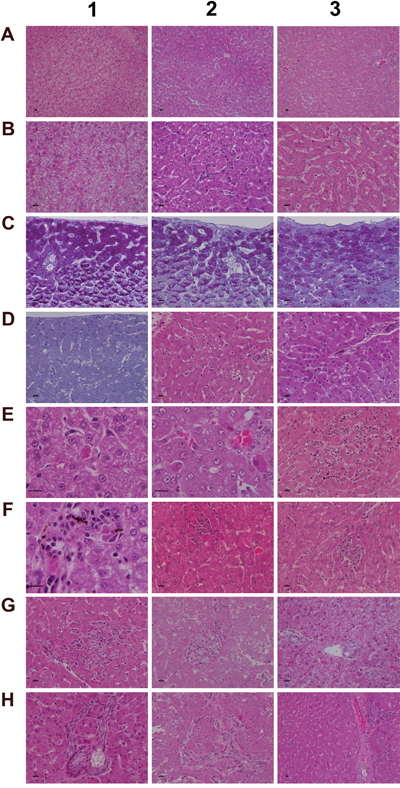 Figure 5: Histology of the liver in control and diclofenac treated animals after daily dosing for 28 days. (Panel A1) H&E staining of a control animal with monolayered trabecular organized hepatocytes and no sign of morphological alteration. (Panel A2) H&E staining of a low dose treated animal with enlarged and partially bilayered trabeculae; hepatocytes present a basophilic cytoplasm. Regenerative periportal hepatocytes are smaller in size. (Panel A3) H&E staining of a high dose treated animal; marked hepatic lobular regeneration with predominatly bilayered trabeculae. (Panel B1) Higher magnification of a liver section of a control animal. The nuclei of hepatocytes are round with small nucleoli. The cytoplasm is cloudy and rich in glycogen. (Panel B2) Higher magnification of a low dose treated animal. The nuclei appear moderately activated; focal sinusoidal inflammatory infiltrates are seen. (Panel B3) Higher magnification of a high dose treated animal with activated vesicular nuclei and prominent nucleoli. Zones of regeneration are organized as bilayered trabeculae with smaller sized hepatocytes and a slight basophilic cytoplasm. (Panel C1) PAS staining of a control liver section. Hepatocytes are rich in glycogen; the glycogen is preserved at the best beneath the capsule and results in marked staining. (Panel C2) PAS staining of a low dose treated animal. A patchier staining is observed with some hepatocytes presenting slight to moderate glycogen depletion. (Panel C3) PAS staining of a high dose treated animal. A patchier staining is observed with some hepatocytes presenting slight to moderate glycogen depletion. (Panel D1) PAS staining of a high dose treated animal with marked and almost complete glycogen depletion. Note the pronounced periportal hepatic steatosis induced by diclofenac treatment. (Panel D2) H&E staining of a high dose treated animal with a patchier periportal micro- and macrovesicular hepatic steaosis. (Panel D3) H&E staining of a low dose treated animal with focal mainly microvesicular hepatic steaosis. (Panel E1) Higher magnification of H&E staining of a low dose treated animal. In the reticle (center of the frame) a fresh apoptotic hepatocyte and its sinusoidal phagocytosis by a Kupffer cell is seen. (Panel E2) Higher magnification of H&E staining of a high dose treated animal. Shown in the lower right quadrant is an initial hepatocyte apoptosis within a steatotic liver section. Note the sinusiodal phagocytized apoptotic hepatocyte by a macrophage in the lower left quadrant. (Panel E3) H&E staining of a low dose treated animal with focal mixed inflammatory cellular infiltrates and groups of apoptotic hepatocytes. (Panel F1-G2) Sequential consolidation of focal interstitial inflammatory infiltrates with final granuloma formation of low (F1-F3) and high dose (G1-G2) treated animals. Panel F1 depicts at higher magnification a rounded focal sinusoidal/interstitial cellular infiltrate that is intermingled with remnants of apoptotic cells of a low dose treated animal. Early consolidation still exhibits a sinusoidal distribution of the infiltrate (F2), ending in a rounded granuloma (F3). Panel G1 depicts a rather acute interstitial infiltrate, and Panel G2 documents the consolidated granuloma in liver sections of high dose treated animals with marked steatosis. (Panel G3) H&E staining of a liver section of a control animal focussing on a normal portal field. (Panel H1 and H2) H&E staining of a low (H1) and high (H2) dose treated animal. Depicted are tangential sections of a portal field with marked arteriolocapillary and cholangiolar proliferations. (Panel H3) H&E staining of a high dose treated animal. Shown is an intact core of a transversely sectioned intact portal field. The proliferations occupy part of the limiting plate as well as periportal regions and likely trigger septal alterations as a result of increased hepatocyte regeneration. The bar represents 10μm.