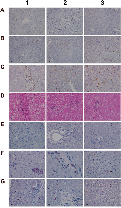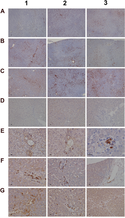 A range of immunohistochemistry studies were performed. Figure 6 depicts IHC staining of IgM and complement factor B in control (A1-A3; D1-D3); low (B1-B3; E1-E3) and high dose (C1-C3; F1-F3, G1-G3) treated animals. A significant dose-dependent increase in IgM was observed, and next to its pronounced sinusoidal expression enhanced staining of IgM was particularly obvious in regions of injury. Some hepatocytes (panel C3) were positive for IgM to potentially indicate the synthesis of this immunoglobulin by harmed cells as had been observed by others [31, 32]. There is a clear evidence for IgM to “dress-up” harmed cells for complement mediated phagocytosis [33, 34]. We therefore hypothesize binding of IgM to danger-associated molecular patterns (DAMPs) expressed on the plasma membrane of harmed hepatocytes to endorse sterile inflammation, opsonization and Fcγ receptor signaling in support of phagocytosis. Moreover, induced expression of complement factor B is of critical importance. This protein is an essential component of the alternate complement pathway and a downstream effector of TLR signaling [35]. Together with C3b the catalytic subunit of factor B functions as the C3 convertase. As with the majority of proteins of the complement system factor B is primarily synthesized in hepatocytes [36]. Unlike controls (panel D1-D3) induced expression of factor B is observed in migrating monocytes, plasma cells (E3, F1) and macrophages (F1-F3) of low and high dose treated animals. Panel G1 exemplifies induced expression of factor B in harmed hepatocytes to possibly support mastocyte infiltration (panel G2) as was reported for the skin [37]. Infiltrates of factor B positive mast cells as well as migrating monocytes and macrophages are also depicted in panel G3 to once again highlight lobular inflammation. Frequently mast cells are associated with vascular endothelium (F2, F3). They are known to engage in complex interactions through binding to integrins and vascular adhesion molecules to support differentiation of mast cell precursors in the circulation and to instruct the endothelium in the orchestration of an inflammatory response [38].
