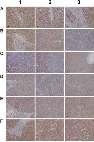We next evaluated the expression of convertase C3 and the C1 inhibitor of the classical pathway. As shown in Figure 7 and unlike controls (panel A1-A3) with minimal and primarily sinusoidal expression an unprecedented induction of the C3 protein was seen particular with harmed hepatocytes to support liver regeneration. Note, previous studies demonstrated the critical importance of C3 in liver regeneration after toxic injury with CCl4 [39]. Moreover, animals lacking C3 display impaired liver regeneration and develop acute liver failure after partial hepatectomy [40]. The expression of the C1 inhibitor was basically absent in control animals (panel D1-D3) but was dose dependently induced in low (E1-E3) and high dose (F1-F3) treated animals. Remarkably, expression of the C1 inhibitor is confined to subpopulations of macrophages with low and high expression of this protein to suggest differences in the activation states/polarization of macrophages and their sensor and effector functions in diclofenac induced inflammation. It is tempting to speculate that induction of the C1 inhibitor protein is an adaptive response to alleviate sinusoidal dilatation induced by inflammatory reactions [41].