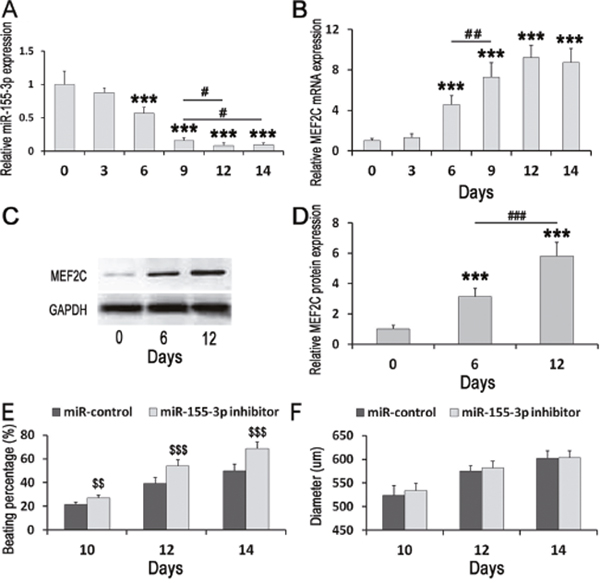 Figure 1: Expressions change of miR-155-3p and MEF2C during ESCs differentiation and effects of miR-155-3p inhibitor on EBs beating and growth. (A-C) MEF2C mRNA and miR-155-3p were detected by Real-time PCR. MEF2C protein was measured by Western blot. (A) miR-155-3p level in the EBs at d0, d3, d6, d9, and d12 was detected. miR-155-3p was down-regulated during ESCs differentiation. (B) MEF2C mRNA in the EBs at d0, d3, d6, d9, and d12 was detected. MEF2C mRNA was up-regulated during ESCs differentiation. n=6. (C) MEF2C protein in the EBs at d0, d6, and d12 was measured. (D) Data indicated the expression level of MEF2C. MEF2C was significantly up-regulated in d6 group as compared to d0 group. n=5. (E and F) ESCs were stably transfected with miR-155-3p inhibitor. (E) miR-155-3p inhibitor promoted the EBs beating. The percentages of EBs beating were calculated at d10, d12, and d14. n=6. (F) miR-155-3p inhibitor did not change EBs growth. The diameters of EBs were measured at d10, d12, and d14. n=6. Data were showed as mean ± S.D. ***P < 0.001 vs d0 group; #P < 0.05;##P < 0.01, and ###P < 0.001; $$P < 0.01, and $$$P < 0.001 vs control group.
