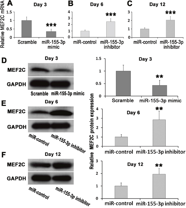 Figure 2: Effects of miR-155-3p mimic and miR-155-3p inhibition on expression of MEF2C. ESCs were transiently transfected with miR-155-3p mimic or stably transfected with miR-155-3p inhibitor. (A-C) Expression change of MEF2C mRNA, n=6. (A) miR-155-3p mimic inhibited expression of MEF2C mRNA in EBs at d3. (B) miR-155-3p inhibitor increased expression of MEF2C mRNA in EBs at d6. (C) miR-155-3p inhibitor increased expression of MEF2C mRNA in EBs at d12. (D-F) Effects of miR-155-3p mimic and miR-155-3p inhibitor on expression of MEF2C protein, n=4. (D) miR-155-3p mimic inhibited expression of MEF2C protein in EBs at d3. (E) miR-155-3p inhibitor increased expression of MEF2C protein in EBs at d6. (F) miR-155-3p inhibitor increased expression of MEF2C protein in EBs at d12. Data were showed as mean ± S.D., n=6. **P < 0.01, and ***P < 0.001 vs control or scramble group.