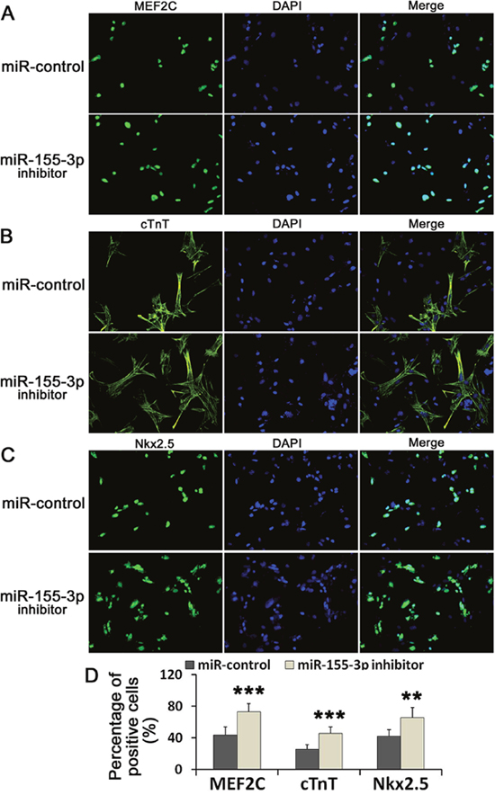 Figure 4: miR-155-3p inhibitor increased the immunoreactivity of MEF2C, cTnT and Nkx2.5. (A-C) The immunoreactivities of MEF2C, cTnT and Nkx2.5 were detected by immunofluorescence at d14. (D) Data showed the percentage of the positive cells. Data were showed as mean ± S.D., n=6. **P < 0.01 and ***P < 0.001 vs control group.
