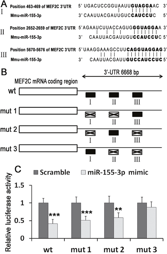 Sequence alignment of miR-155-3p and its target sites in the 3’-UTR of MEF2C were listed (Figure 5A). To test whether miR-155-3p could directly target the 3’-UTR of MEF2C mRNA in a sequence-specific manner, we generated a luciferase construct harbouring a potential binding site for miR-155-3p and produced three mutant constructs with potential target sites (Figure 5B). Without any mutation, miR-155-3p repressed 58.4% of luciferase activity of the reporter construct. Both mut 1(mutation sites of I and II) and mut 2 (mutation sites of I and III) repressed luciferase activity. However mut 3 (mutation sites of II and III) did not change luciferase activities (Figure 5C). The results suggested that miR-155-3p can repress MEF2C expression through the direct interaction with II or III.