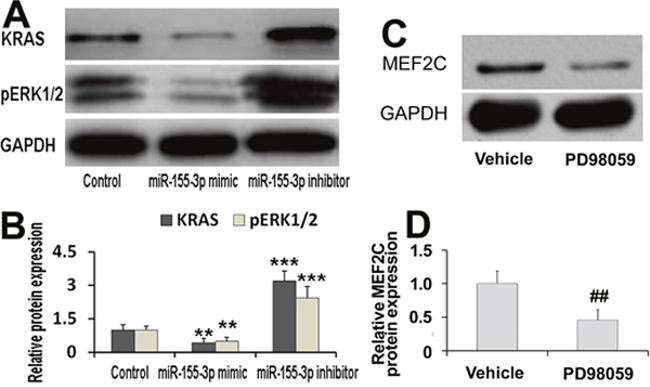 Figure 6: Effects of miR-155-3p on expressions of KRAS and pERK1/2. (A, B) KRAS and pERK1/2 protein levels were measured by Western blot. KRAS and pERK1/2 protein was detected in EBs at d3. miR-155-3p mimic repressed expressions of KRAS and pERK1/2. By contrast, miR-155-3p increased expressions of KRAS and pERK1/2. (C, D) ERK1/2 inhibitor, PD98059 significantly decreased expression of MEF2C protein. At d9, the EBs were treated with 50 μM PD98059 for 24 h. Data were showed as mean ± S.D., n=4. **P < 0.01 and ***P < 0.001 vs control group; ##P < 0.01 vs vehicle group.
