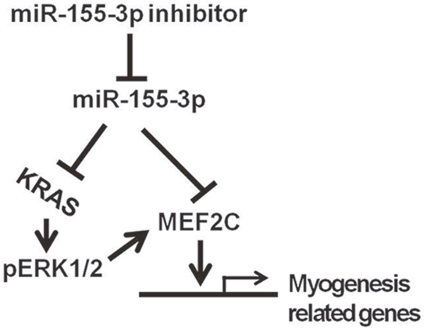 In conclusion, our data indicated that miR-155-3p was down-regulated during cardiac differentiation of ESCs. miR-155-3p inhibited the expression of MEF2C. miR-155-3p inhibition increased the percentage of EBs beating and facilitated the expressions of MEF2C, GATA4, Nkx2.5, and cTnT. In addition, miR-155-3p inhibition increased KRAS and pERK1/2 expression. These data illustrated that miR-155-3p inhibition promoted cardiac differentiation of ESCs and its mechanisms are involved in RAS-ERK1/2 signaling and MEF2C.