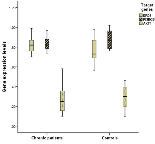 The DRD2 expression levels in chronic schizophrenia patients were statistically higher than those in controls (t=2.168, p=0.037). The PI3KCB (t=1.469, p=0.142) and AKT1 (t=0.500, p=0.620) mRNA levels demonstrated no significant differences between chronic schizophrenia patients and healthy controls (Table 1, Figure 1).