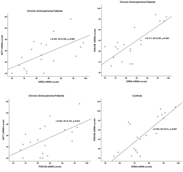 In chronic schizophrenia group, there were statistical correlations between the expression levels of PI3KCB and DRD2 (r=0.771, p<0.001), DRD2 and AKT1 (r=0.592, p=0.008), and PI3KCB and AKT1 (r=0.562, p=0.012). And only the correlation of PI3KCB and DRD2 expression levels was significantly detected in the control group (r=0.782, p<0.001) (Table 2, Figure 2).
