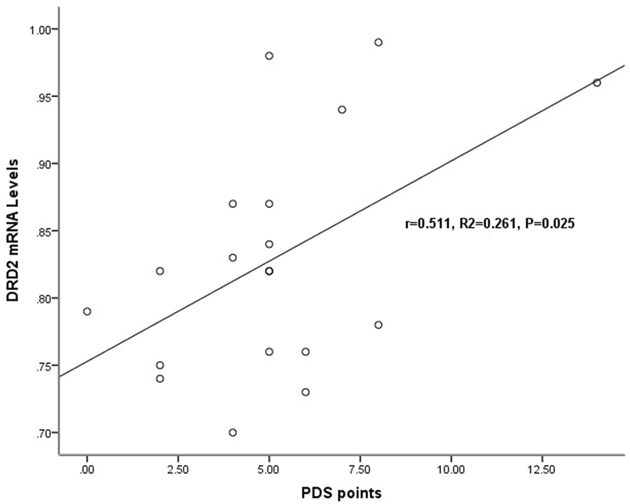 In chronic schizophrenia group, there was no significant relationship between target genes expression levels and the total PANSS score, the positive symptom score, the negative symptom score or the general pathological symptom score. However, the relationship of DRD2 mRNA levels (r=0.511, p=0.025) and the PDS score was significantly observed (Table 3, Figure 3).