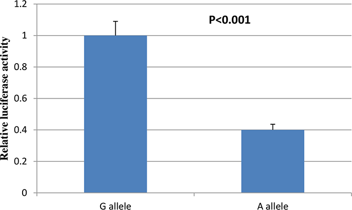 To evaluated the potential functions of ADIPOQ rs74577862, we conducted the Site-Directed Mutagenesis and dual-luciferase reporter assay. As shown in Figure 1, we found that a significant decrease in luciferase expression for the reconstructed plasmid with rs74577862 A allele in comparison to the one with G allele in HAECs cell lines (P<0.001). This means allele A was associated with lower level ADIPOQ, then increased risk of atherosclerosis.