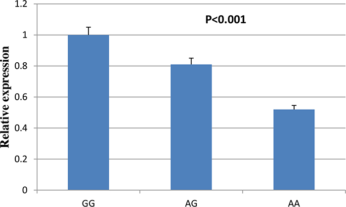 We then assessed the influence of ADIPOQ rs74577862 on the expression of ADIPOQ gene in the plaque tissues of 50 individuals was confirmed by real time PCR. As shown in Figure 2, the atherosclerosis risk allele of rs74577862 correlated with decreased expression level of ADIPOQ gene (P<0.001).