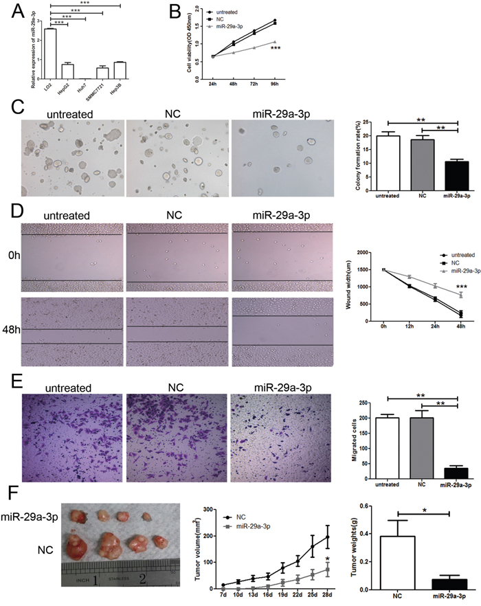 Figure 2: Overexpression of miR-29a-3p inhibited cancer cell growth and migration in vitro and in vivo. (A) QRT-PCR analysis of miR-29a-3p expression in normal human hepatic cell line (LO2) and HCC cells lines (SMMC-7721, Hep3B, HepG2, and Huh 7). (B) Proliferation ability test by CCK8 assay of HepG2 cells after transfection with miR-29a-3p mimics, negative control (NC) or no transfection (untreated). (C) Colony formation assay and statistical results in HepG2 cells after transfection with miR-29a-3p mimics, NC or untreated. (D) Wound healing assay of HepG2 cells after transfection with the miR-29a-3p mimics, NC or untreated. (E) Transwell migration assay of HepG2 cells after transfection with the miR-29a-3p mimics, NC or untreated. (F) Functional test of miR-29a-3p in vivo and statistical results. (*P < 0.05, **P < 0.01, ***P < 0.001).