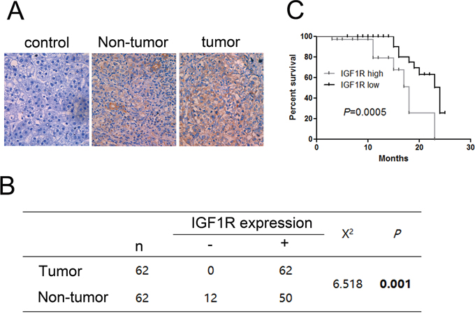 Figure 4: Immunohistochemistry test of IGF1R in 62 HCC tissues and their corresponding adjacent non-tumorous livers. (A) Expression of IGF1R in paired tumor samples and their corresponding adjacent non-tumorous livers. (B) Chi-square test of the 62 patients for the paired tissues. Each group was shown by the distribution of IHC staining scores. (C) Kaplan-Meier analysis associated with overall survival for low and high expression of IGF1R (P = 0.0005). Original magnification: 400×.