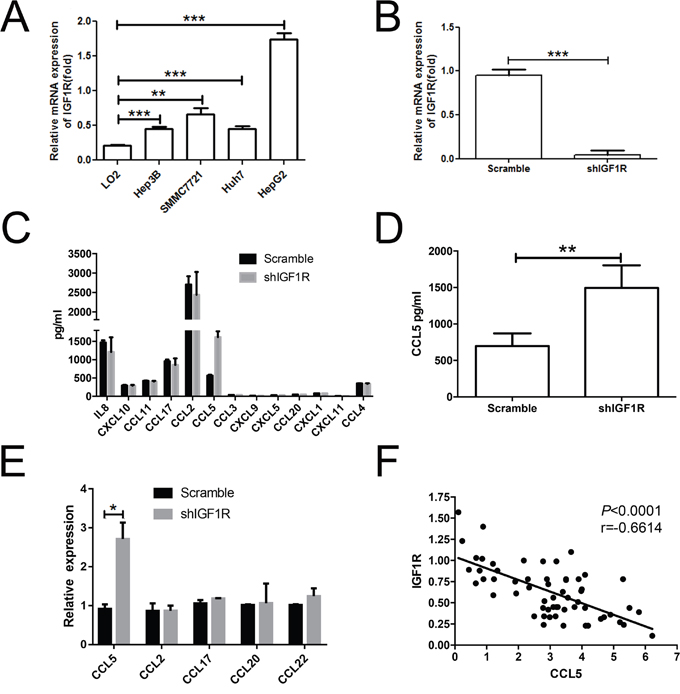 Figure 5: Knockdown of IGF1R led to the increase of CCL5 secretion. (A) Real-time PCR analysis of IGF1R expression in LO2, SMMC-7721, Hep3B, HepG2, and Huh7 cell lines. (B) The mRNA level of IGF1R was verified in sorted HepG2 cells after transfection. (C) Results of scramble shRNA and shIGF1R HepG2 cells supernatants analyzed by multiplex assay in relation to chemokines. (D) The protein level of CCL5 in sorted HepG2 cells was assessed by using ELISA. (E) The level of CCL5 in sorted HepG2 cells was assessed by RT-PCR. (F) Association between the expression of IGF1R and the intensities of CCL5 in tumor lesions. (*P < 0.05, **P < 0.01, ***P < 0.001).