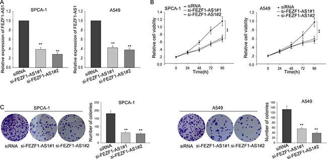 Figure 2: Silenced FEZF1-AS1 suppressed LAD cells proliferation. (A) A549 and SPC-A1 cells were transfected with si-FEZF1-AS1 and transfection efficiency was measured by qRT-PCR. (B–C) The effect of FEZF1-AS1 knockdown on cell proliferation was measured by MTT and colony formation assays. *P < 0.05, **P < 0.01, Means ± SD. were shown.