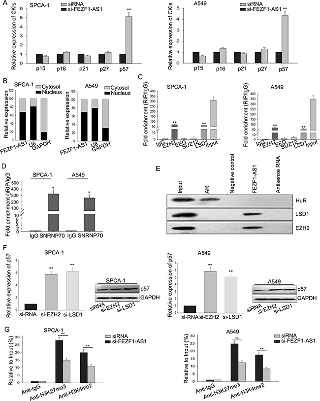 Figure 4: FEZF1-AS1 epigenetically silenced p57 by recruiting EZH2 and LSD1 to the promoter of p57. (A) The levels of CKIs were measured by qRT-PCR in A549 and SPC-A1 cells when FEZF1-AS1 was knockdown. (B) The level of FEZF1-AS1 in nucleus versus cytosol was measured by qRT-PCR. (C) RIP assay was performed by using EZH2, LSD1 antibodies for immunoprecipitation. (D) U1 binding with SMPNR70 was used as a positive control. (E) Biotinylated FEZF1-AS1 or antisense RNA was incubated with total-cell extracts (SPC-A1 cells); the level of EZH2 and LSD1 proteins in immunoprecipitates with FEZF1-AS1 was measured by western blot assay. The immunoprecipitates of HuR protein with AR RNA was used as a positive control. (F) p57 mRNA and protein levels were detected by qRT-PCR and western blot assay when FEZF1-AS1 was knockdown. (G) ChIP-qRT-PCR of EZH2 occupancy and H3K27me3 or LSD1 occupancy and H3K4me2 binding to the promoter of p57 in A549 and SPC-A1 cells were treated with si-FEZF1-AS1 or si-RNA; IgG was a negative control. *P < 0.05, **P < 0.01, Means ± SD, were shown.