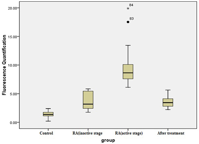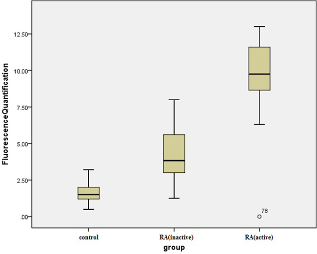 Figure 4: Comparison of the PCNP relative expression levels in patients with inactive and active RA. Active RA and inactive RA versus control group, P < 0.001; active RA versus inactive RA, *P < 0.001.