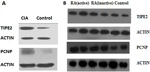 Figure 5: Western blot results. (A) The left column shows binds of proteins expressed in CIA mice; the right column shows binds of proteins expressed in the control group. Protein expression in CIA mice was significantly greater than that in the control group. (B) There are three groups of human lymphocytes. Protein expression in the RA groups was significantly greater than that in the control group.