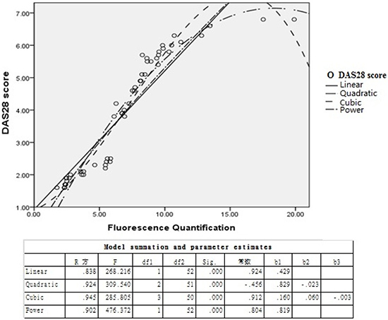 Clinical manifestations and laboratory abnormalities of 54 RA patients were analyzed according to DAS28 scores, and the results showed a significant positive correlation between DAS28 score and TIPE2 expression in peripheral blood of RA patients (R2 = 0.945, P = 0.001), which was identical to the cubic model (Figure 6).