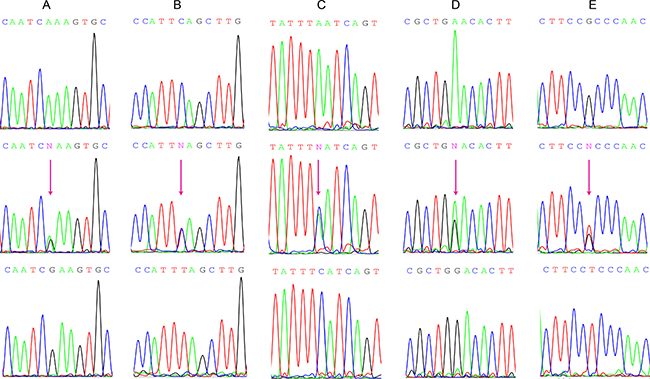 Figure 2: Genomic DNA Sanger sequencing of the 5 different SNP genotypes in FAMLF gene family. (A) SNP1 contained three genotypes: AA、AG、GG. (B) SNP2 contained three genotypes: CC、CT、TT. (C) SNP3 contained three genotypes: CC、CA、AA. (D) SNP4 contained three genotypes: GG、GA、AA. (E) SNP5 contained three genotypes: GG、GT、TT.