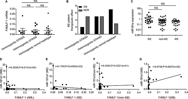 Figure 3: Clinical significance of haplotype GTAGG in FAB-M2, relationship between the expression level of miR-181a1 and FAMLF-1 in AML. (A) Comparation the expression of FAMLF-1 in FAB-M2 among disease haplotypes and normal haplotype(P > 0.05). (B) Comparation the CR rate in FAB-M2 among disease haplotypes and normal haplotype(P > 0.05). (C) The expression level of miR-181a1 in patients with FAB-M2, FAB non-M2 or FAB-M5(P > 0.05). (D) The relationship between the expression level of miR-181a1 and FAMLF-1 in patients with AML (P = 0.0151). (E) The relationship between the expression level of miR-181a1 and FAMLF-1 in patients with FAB-M2 (P > 0.05). (F) The relationship between the expression level of miR-181a1 and FAMLF-1 in patients with FAB non-M2 (P = 0.0231). (G) The relationship between the expression level of miR-181a1 and FAMLF-1 in patients with FAB-M5 (P = 0.0027).