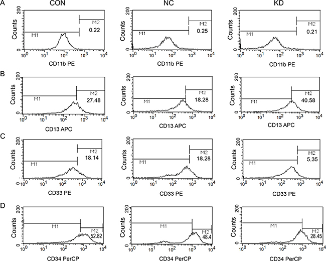 Seen from Figure 5A, after FAMLF-1 gene silencing, CD11b expression level of Kasumi-1 cells was no significant difference from the CON and NC groups (P > 0.05). Seen from Figure 5B, after FAMLF-1 gene silencing, CD 13 expression level of Kasumi-1 cells was significant higher than the CON and NC groups (P < 0.05). Seen from Figure 5C, after FAMLF-1 gene silencing, CD33 expression level of Kasumi-1 cells was significant lower than the CON and NC groups (P < 0.05). Seen from Figure 5D, after FAMLF-1 gene silencing, CD34 expression level of Kasumi-1 cells after FAMLF-1 gene silencing was significant lower than the CON and NC groups (P < 0.05).
