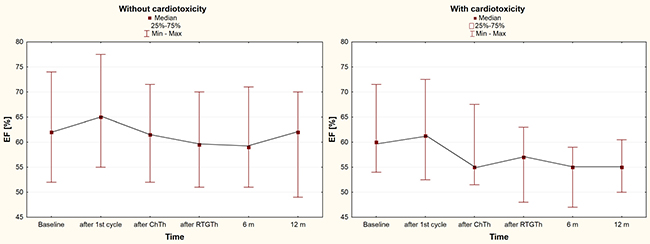 During their visits to the Heart Center, the patients underwent echocardiography. The schedule of echocardiographic monitoring was as follows: before treatment (up to 7 days before dosing), 24 hours after completion of the first cycle of chemotherapy, 24 hours after chemotherapy cessation, at the end of radiotherapy, and 6 and 12 months after chemotherapy cessation.