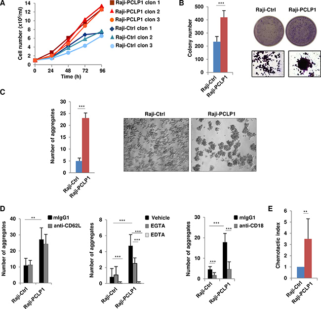 Figure 2: Ectopic expression of PCLP1 induces lymphoma cell proliferation, clonogenicity, cell-to-cell adhesion, and chemotaxis. (A) Cell proliferation of Raji-PCLP1 and Raji-Ctrl cell clones was measured counting the number of viable cells at different time points of culture in complete medium using the trypan blue exclusion assay. (B) Colony formation of Raji-PCLP1 and Raji-Ctrl cells cultured in methylcellulose medium for 11 days. Colonies were stain with crystal violet and counted using an inverted microscope. The graph depicts the number of colonies per well from four independent experiments performed in triplicate. Representative microscope pictures and enlarged images of colony formation after crystal violet staining are shown. Statistical analysis of mean ± SD was calculated using two-tailed paired Student´s t-test. ***P < 0.001. (C) Cell-to-cell adhesion was calculated as the number of cell aggregates formed at 72 h of culture. Representative microscope images of cell aggregates using a 10× objective are shown. The size bar indicates 100 μm. (D) Cells were incubated in the presence of anti-CD62L mAb or isotype control (mIgG1) (left) or in the presence of anti-CD18 mAb or mIgG1 (right) and the number of aggregates were counted at 2 h. Cells were cultured in the presence of 1 mM EDTA, 1 mM EGTA or vehicle and the number of aggregates were counted at 24 h (middle). The graphs in C and D represents the mean ± SD of the number of aggregates per field containing more than 20 cells from 3 independent experiment and analyzing 10 fields in each experiment. Statistical analysis was calculated using no-paired Student´s t-test (C) and Mann-Whitney U test (D). **P < 0.01 ***P < 0.001. (E) Chemotactic migration of Raji-PCLP1 or Raji-Ctrl toward 100 ng/ml CXCL12 using Transwell chambers. Data represents the mean chemotactic index ± SD normalized to control cells from six independent experiments. Statistical analysis was calculated using Mann-Whitney U test. **P < 0.01.
