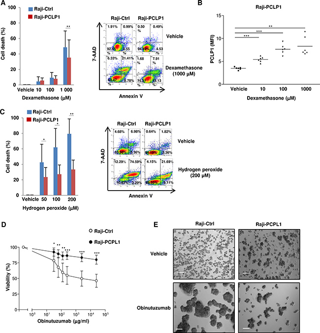 Figure 3: PCLP1 provides resistance to dexamethasone, reactive oxygen species and obinutuzumab-induced death in B-cell lymphoma cells. (A) Raji-Ctrl and Raji-PCLP1 cells were treated with increasing concentrations of vehicle or dexamethasone for 72 hours and cell death was analyzed after Annexin V-PE/7´AAD staining by flow cytometry. The graph on the left shows the mean percentages ± SD of total specific cell death (including early apoptosis, late apoptosis and necrotic cells) from six independent experiments after subtracting the spontaneous cell death (vehicle). The percentage of specific cell death was calculated as follows: [(% lysis of target cell – % spontaneous cell death)/(100% – % spontaneous cell death)] × 100. Representative dot plots showing Annexin V/7AAD staining in cells treated with vehicle or 1000 μM dexamethasone are shown (right). As displayed in the dot plots, the spontaneous cell death (Annexin V PE positive/7ADD negative, Annexin V PE positive/7ADD positive and Annexin V PE negative/7ADD positive cells) in cells cultured with the vehicle was approximately 7.5% in Raji-Ctrl and 5.5% in Raji-PCLP1 cells. (B) Expression of PCLP1 on Annexin V and 7ADD double-negative population of cells treated with dexamethasone or vehicle by flow cytometry. (C) Raji-Ctrl and Raji-PCLP1 cells were treated with increasing concentrations of vehicle or H2O2 for 6 h and cell death was analyzed as indicated in A. The graph on the left shows the mean percentages ± SD of total cell death from five independent experiments after subtracting the spontaneous cell death (vehicle). Representative dot plots showing Annexin V/7AAD staining in cells treated with vehicle or 200 μM H2O2 are shown (left). As displayed in the dot plots, the spontaneous cell death in the presence of vehicle was approximately 17.0% in Raji-Ctrl and 5.9% in Raji-PCLP1 cells. (D) Cells were incubated overnight with increasing concentrations of obinutuzumab or vehicle and cell viability was measured based on Annexin V/7AAD double negative staining relative to vehicle-treated cells. Data show the mean percentages ± SD of viable cells from six independent experiments. (E) A representative image of the homotypic adhesion induced by obinutuzumab as visualized by light microscopy is shown. The size bar indicates 100 μm. Statistical analysis was calculated using two-tailed paired Student´s t-test. *P < 0.05. **P < 0.01. ***P < 0.001.