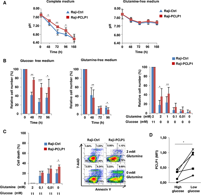 Figure 4: PCLP1 regulates B-cell lymphoma cell metabolism. (A) Measurement of pH of Raji-PCLP1 or Raji-Ctrl cell culture medium containing glutamine (complete medium) (left) or in the absence of glutamine (right) at the indicated time points. (B) Proliferation of Raji-PCLP1 and Raji-Ctrl cells in glucose-free culture medium (left) or glutamine-free culture medium (middle) at different time points. The number of viable cells was normalized to their counterparts grown in complete medium. Data show the mean ± SD of five independent experiments. Proliferation of Raji-PCLP1 and Raji-Ctrl cells in glucose-free conditions and decreasing concentrations of glutamine at 72 h of culture (right). The number of viable cells was normalized to their counterparts grown in complete medium. Data show the mean ± SD of six independent experiments. (C) Death of Raji-PCLP1 and Raji-Ctrl cells under glutamine-deprivation conditions. Cells were incubated in the presence of glucose and decreasing concentration of glutamine and the percentage of cell death was determined at 72 h of culture after Annexin V-PE/7´AAD staining by flow cytometry. Data show the mean ± SD of five independent experiments. Representative dot plots showing Annexin V/7AAD staining in cells treated with complete medium (2 mM glutamine/11 mM glucose) or glutamine free medium (0 mM glutamine/11 mM glucose) are depicted. (D) Effect of glucose depletion on PCLP1 expression in Raji cells. Cells were cultured in high-glucose medium (11 mM) or low-glucose medium (0.5 mM) for 72 h and the expression of PCLP1 on cell surface was determined by flow cytometry. Data show MFI of PCLP1 expression from five independent experiments. Statistical analysis was calculated using two-tailed paired Student´s t-test. *P < 0.05. **P < 0.01. ***P < 0.001.