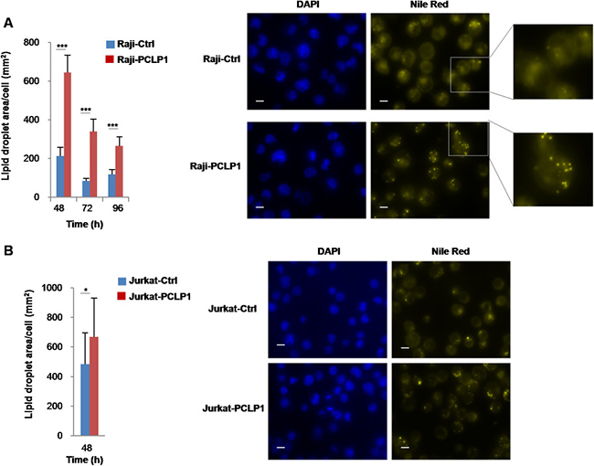 Figure 5: PCLP1 induces lipid droplet synthesis. Determination of lipid droplet content in Raji-PCLP1 and Raji-Ctrl cells (A) or Jurkat-PCLP1 and Jurkat-Ctrl cells (B) by fluorescence microscopy. Cells were cultured in complete medium for the indicated times, fixed and stained with Nile Red for the detection of neutral lipid droplets. Ten fields were randomly selected using a 60× oil objective and the total area of lipid droplets per cell was calculated employing ImageJ software. Bar graphs represent the quantitative analysis of lipid droplets content per cell. Mean ± SD of lipid droplet area per cell is shown. Statistical analysis was calculated using Mann-Whitney U test. *P < 0.05. **P < 0.01. ***P < 0.001. Representative fluorescence microscopy images depicting lipid droplets stained with Nile Red (right panels, yellow). Nuclei were labeled with DAPI (left panels, blue). Digital zoom of a selected area is shown. The size bar indicates 10 μm.