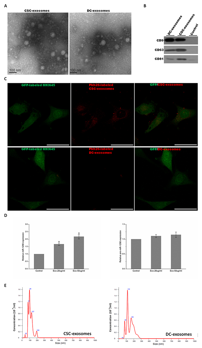 Figure 2: Characterization of exosomes. (A) Electron micrograph of CSC and DC exosomes. The image shows small vesicles of approximately 50-80nm in diameter. The scale bar indicates 100nm. (B) Western blot characterized exosomes derived from CSCs and DCs using antibodies against exosomal protein markers (CD9, CD63 and CD81). Control: concentrated medium supernatant from MKN45. (C) Exosomes were initially labeled with Pkh-26. Immunofluorescent analysis of CSC-exosomes treated and DC-exosomes treated MKN45 cells, showing CSC-exosomes but not DC-exosomes can incorporate and label the original MKN45 cells. Scale bar: 50 μm. (D) MiR-1290 expression levels in MKN45 treated with 0, 20 and 50 μg/ml of CSC-exosomes for 24 hours were determined by quantitative real-time PCR analysis (left plot). Pre-miR-1290 expression in MKN45 treated with different amounts of CSC-exosomes (right plot). Values are the mean ± SD of 3 independent experiments *p ≤ 0.05; **p ≤ 0.01. (E) The diagram shows the size and concentration of exosomes derived from CSCs (left) and DCs (right) by use of nanoparticle tracking analysis (NTA).
