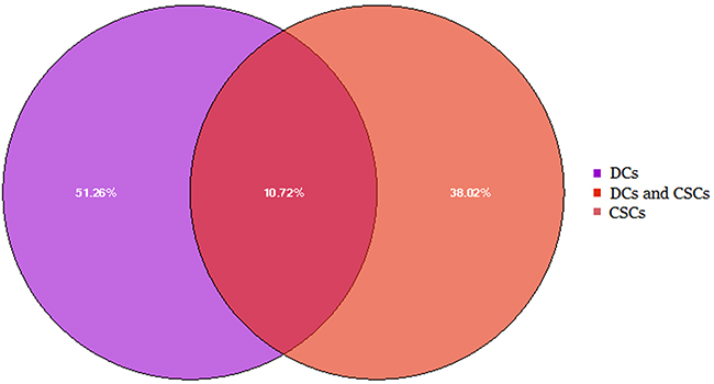 Figure 3: Comparison of total RNA reads in the exosomes from CSCs and DCs. Result showed that common reads only account for 10.72%.