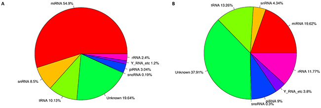Figure 4: Nucleotide composition of exosomes from CSCs and DCs. (A) The total RNA reads sequenced in the exosomes from CSC cells, showed the annotion of ncRNA. (B) The total RNA reads sequenced in the exosomes from DCs, showed the annotion of ncRNA. The database of miRBase (version:21), Rfam11.0 (rfam.janelia.org), UCSC (gtrnadb.ucsc.edu), pirnabank (http://pirnabank.ibab.ac.in/) were separately used for the annotion of miRNA, rRNA, snRNA, snoRNA, tRNA, piRNA. The percentage is calculated as a percentage of clean reads.