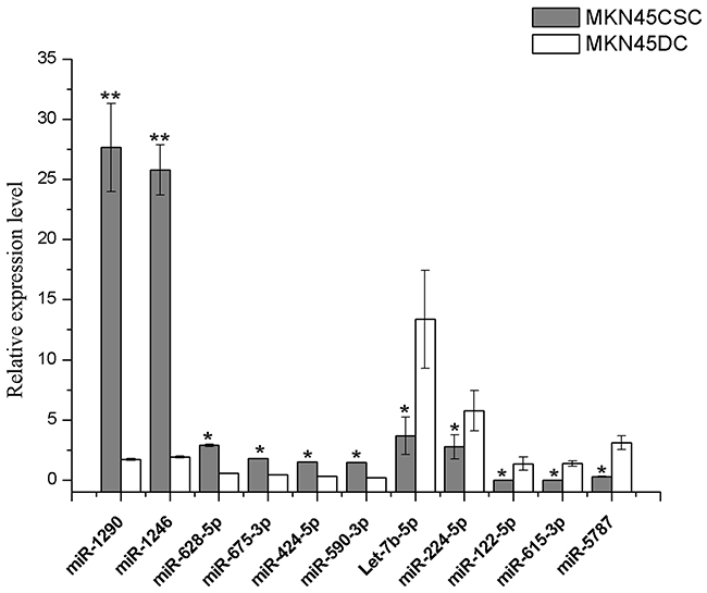 Figure 6: Expression of signature microRNAs. Quantitative RT-PCR using Taqman miRNA assays was used to investigate the expression of 11 miRNAs in exosomes purified from CSC and DCs. The obtained values were normalized to hsa-miR-16a as an internal control. Grey, exosomal miRNAs from CSCs; white, exosomal miRNAs from DCs. Error bars show standard error of the mean (SEM). The experiments were repeated three times independently. *P<0.05, **P<0.01 compared with DCs.