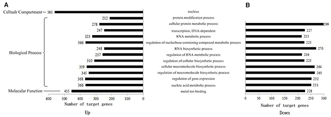 Figure 7: GO distribution of target genes in up- and down-regulated groups. 11 selected signature miRNAs were classified by gene ontology in two groups. (A) Up-regulated group, (B) down-regulated group.