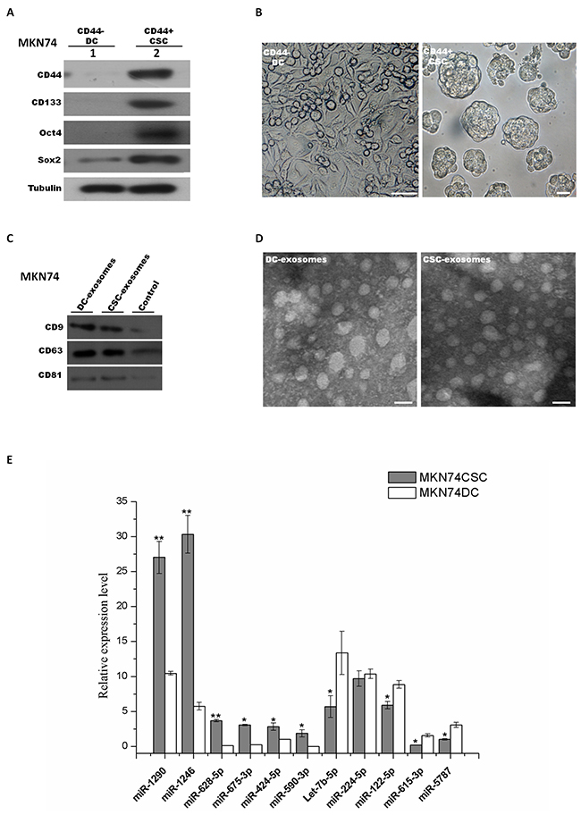 Figure 9: Exosomal signature miRNAs were validated in MKN74 derived CSCs and DCs. MKN74 cancer stem-like cells were isolated and characterized. Signature miRNAs were further validated in MKN74 CSC-exosomes and DC-exosomes. (A) MKN74 derived CSCs and DCs were isolated and FACS-sorted from MKN74 cell line by using same strategy. Expression levels of CD44, CD133, Sox2 and Oct4 were determined by western blot between sorted MKN74 CSC population and DC population. (B) Formation of gastrospheres was observed in culture on day 8 (right) by plating CD44+ cells at clonal density. CD44- cells, represented for differentiated cells (DCs), were plated on adherent surface (left). Scale bars: 50 μm. (C) Western blot characterized exosomes derived from MKN74 CSCs and DCs using antibodies against exosomal protein marker (CD9, CD63 and CD81). (D) Electron micrograph of MKN74 CSCs and DCs exosomes. The scale bar indicates 100nm. (E) Quantitative RT-PCR was used to validate the expression of exosomal signature miRNAs in MKN74 CSC and DCs. The obtained values were normalized to hsa-miR-16a as an internal control. Grey, exosomal miRNAs from CSCs; white, exosomal miRNAs from DCs. Error bars show standard error of the mean (SEM). The experiments were repeated three times independently. *P<0.05, **P<0.01 compared with DCs.