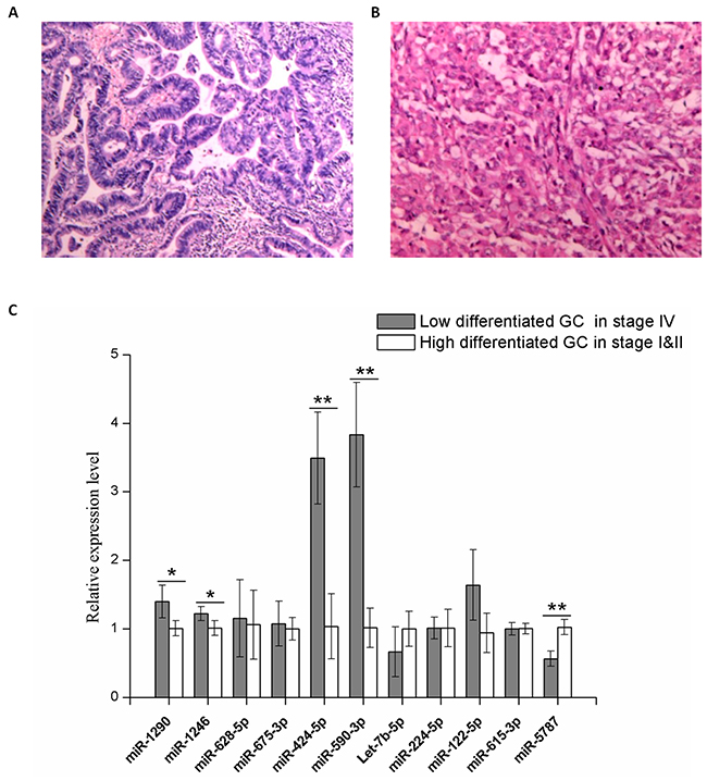 Figure 10: Validation of the serum levels of 11 signature miRNAs in exosomes. A total of 12 patients were divided into two groups upon final pathology. (A) Representative biopsy result that was read as high-differentiated GC. (B) Representative biopsy result that was read as low-differentiated GC. (C) Quantitative RT-PCR using Taqman miRNA assay was used to investigate the expression of 11 signature exosomal miRNAs purified from GC patients serum. Grey, serum sample of stage IV GC with low differentiation (n=6); white, serum sample of stage I&II GC with high differentiation (n=6). Y axis was presented as relative expression (normalized with respect to miR-16a and compared with the average of reference sample in each group; 2-ΔΔCt). Error bars show standard error of the mean (SEM). The experiments were repeated three times independently. P-values adjusted for multiple testing by t-test were shown. *P<0.05, **P<0.01.